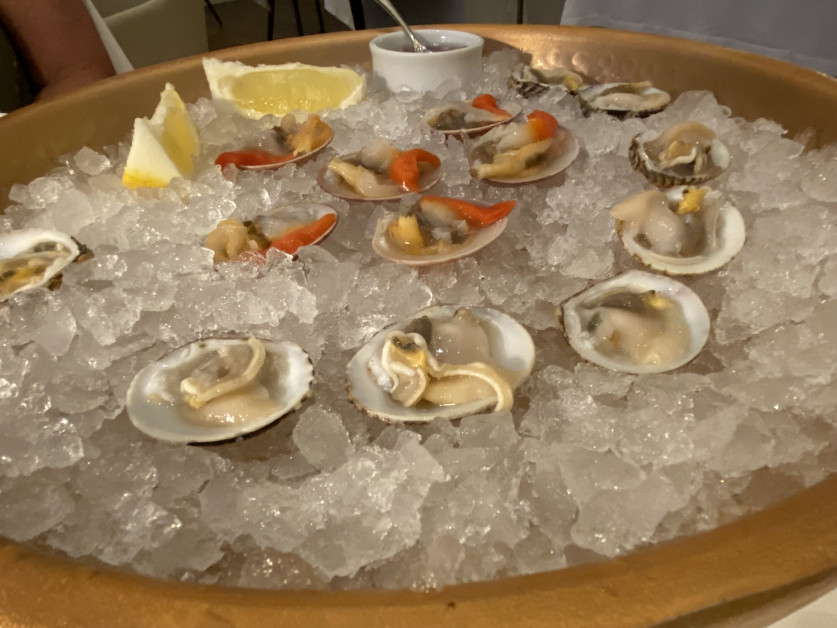 And just like that, our starters are triumphantly delivered to admiring glances from a few of our fellow diners. A perfect match for the wine it must be said. A tray of delicious smoked eel crostini (€16) and an impressive, iced platter of traditional gialisteres,(€29) red and white clams with a red vinegar vinaigrette and a few chunks of fresh lemon.