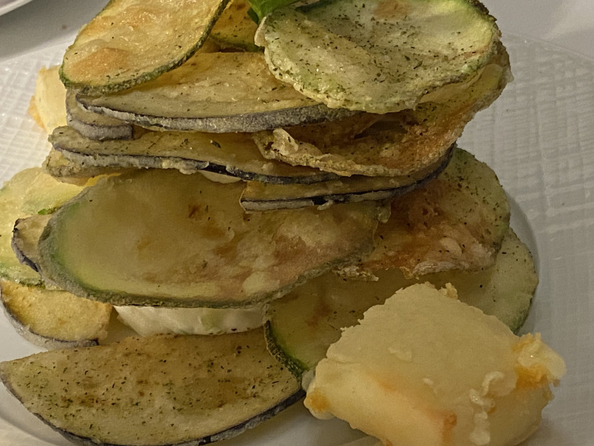 But Constantino has a surprise in store. After ten years, I get to taste another Milos stack as I watch it proudly placed on the table. And it doesn’t disappoint in the slightest. Delicately fried slices of courgette and aubergine just as I remembered, with that hidden burst of tzatziki inside.