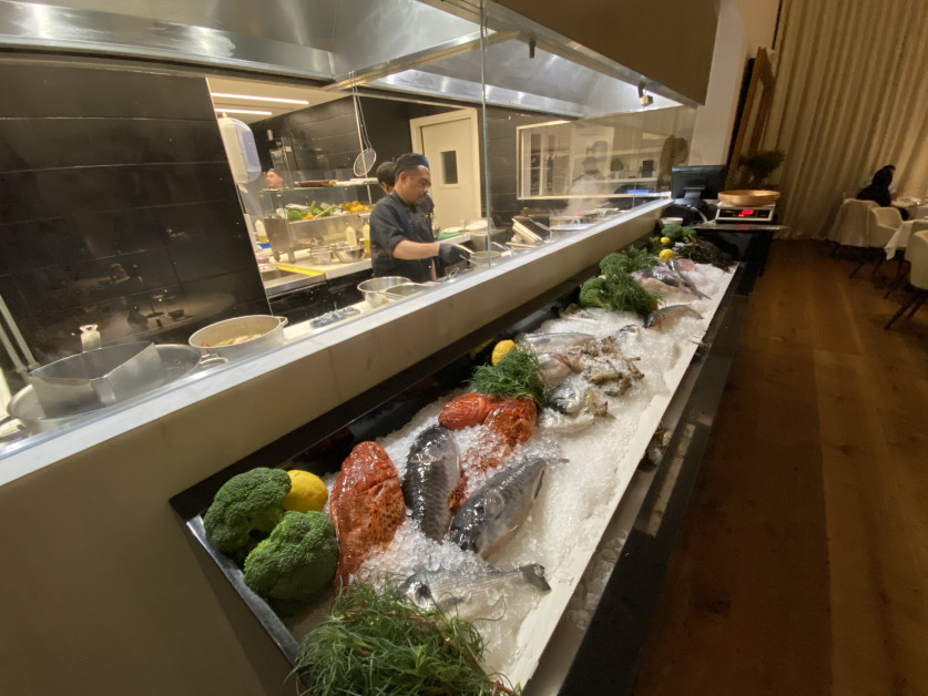 I’m enthusiastically greeted like a family member by Constantino, a legendary member of the Estiatorio Milos Athens team for over two decades. We chat briefly about both our times at Milos Hilton before he walks me over to the long table to show me something special. “Look at this” he points enthusiastically,” grey mullet, very hard to find, we’ll cook it for you. Just grilled with some lemon juice. Perfect.”